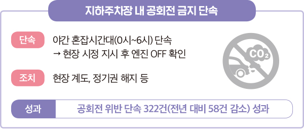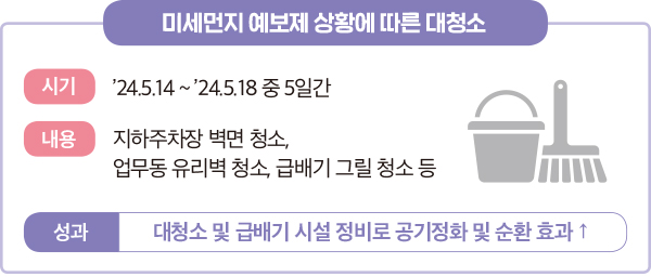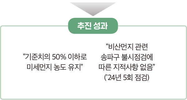 공사는 가락몰 지하 주차장을 방문하는 시민들과 지하 작업장에서 근무하는 유통인을 위해 다양한 공기질 개선 대책을 시행하여 미세먼지를 전년 대비 26% 감소시키는 성과를 달성하였다.(’23년 86.8㎍/㎥ →’24년 64.3㎍/㎥)