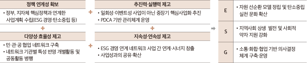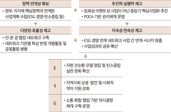 민·관·공이 함께하는 탄소중립 실천운동은 사업의 다양성과 다각화를 가능하게 했고, 인력·비용·시간 절감을 통해 행정 효율성도 높였다. 특히 네트워크 기관 간 ESG 경영을 서로 연계함으로써 개별 기관이 단독으로 추진할 때보다 사업의 지속성과 연속성을 높인 점이 큰 성과로