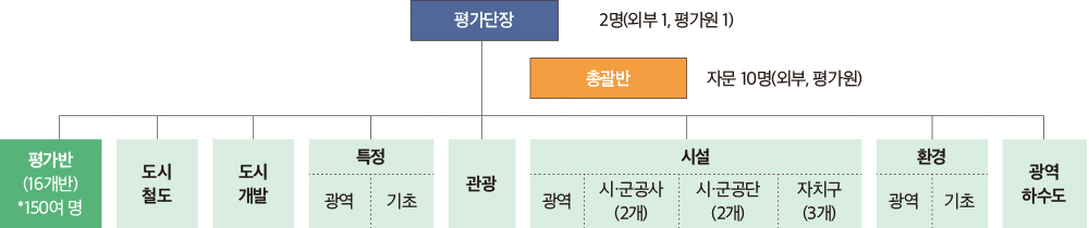 경영평가를 수행하는 경영평가단은 유형별 지표별 외부 전문가와 내부 전담 PM으로 150명 규모로 7개 평가유형 16개 평가반으로 구성해 운영하고 있다. 경영평가의 객관성과 공정성을 위해 평가위원 공모·선정 과정과