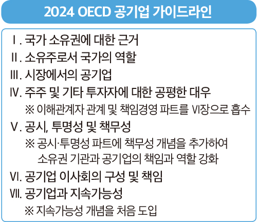 최초로 제안되어 공기업 운영의 국제 규범으로 통용되고 있는 OECD 공기업 지배구조 가이드라인은 약 10년 주기로 업데이트되고 있는데, 2024년 개정된 가이드라인에서는 공기업의 투명성과 책무성과 함께 공기업의