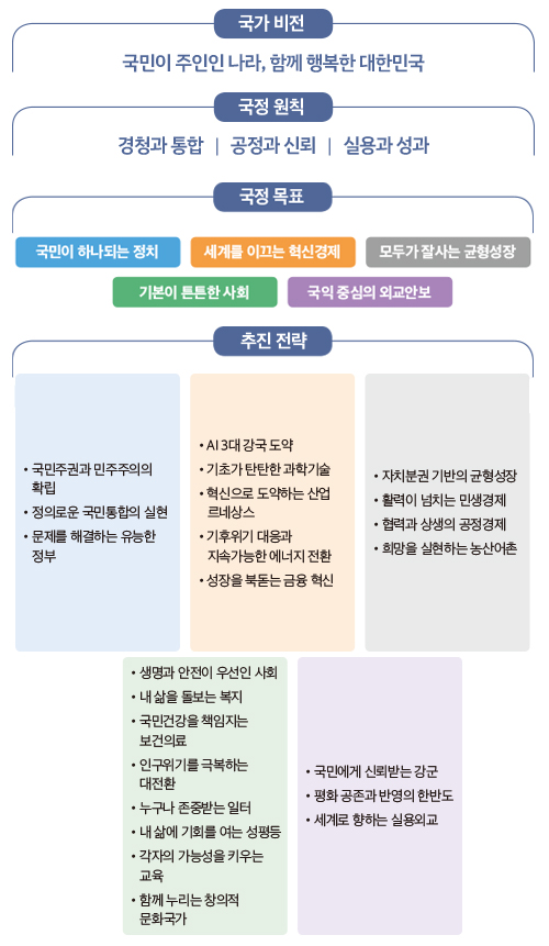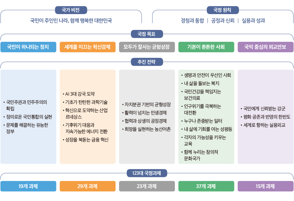 이재명정부 5개년 국정운영계획에서는 “국민이 주인인 나라, 함께 행복한 대한민국” 국가 비전에 따라 국정 3대 원칙(경청과 통합, 공정과 신뢰, 실용과 성과)하에 5대 국정목표와 23대 추진전략, 그리고 123대