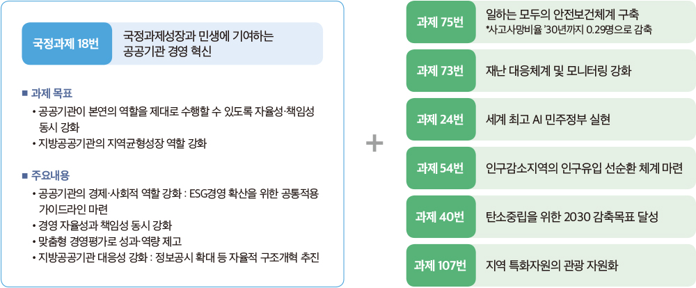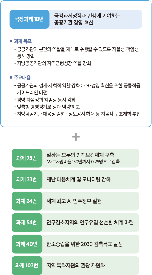 이 중에 국정과제 18번 ‘성장과 민생에 기여하는 공공기관 경영혁신’은 중앙 공공기관뿐만 아니라 모두 요구되는 과제로서 공공기관 본연의 역할 및 ESG 경영 확산 그리고 지역균형성장에 있어 지방공공기관의 대응성