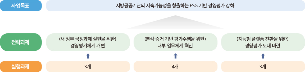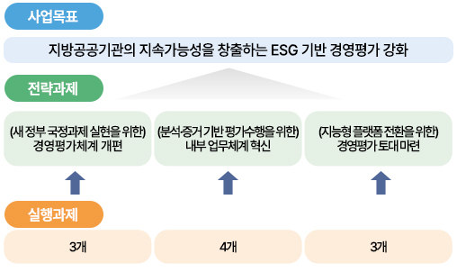 사업목표로 “지방공공기관의 지속가능성을 창출하는 ESG 기반 경영평가 강화”를 제시하고 이를 달성하기 위한 3개 전략과제(경영평가 체계 개편, 내부 업무체계 혁신, 지능형 플랫폼 평가 토대 마련)와 10개
