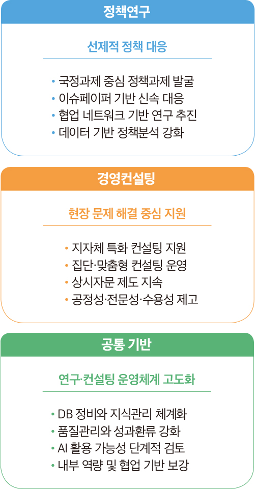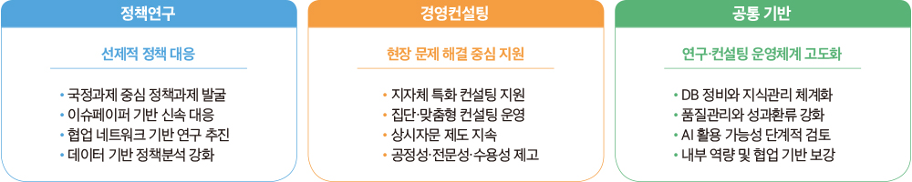 확보가 포함되어 있으며, 연구·컨설팅 품질 향상과 성과 확산을 위한 관리 체계도 함께 마련된다.