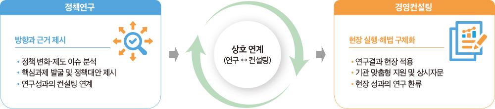 이러한 구조를 바탕으로 정책연구는 정부정책과 지방공공기관 제도 변화에 대한 방향과 근거를 제시하고, 컨설팅은 이를 현장에서 적용 가능한 해법으로 구체화한다. 즉 연구는 ‘무엇을 해야 하는가’를 제시하고, 컨설팅은