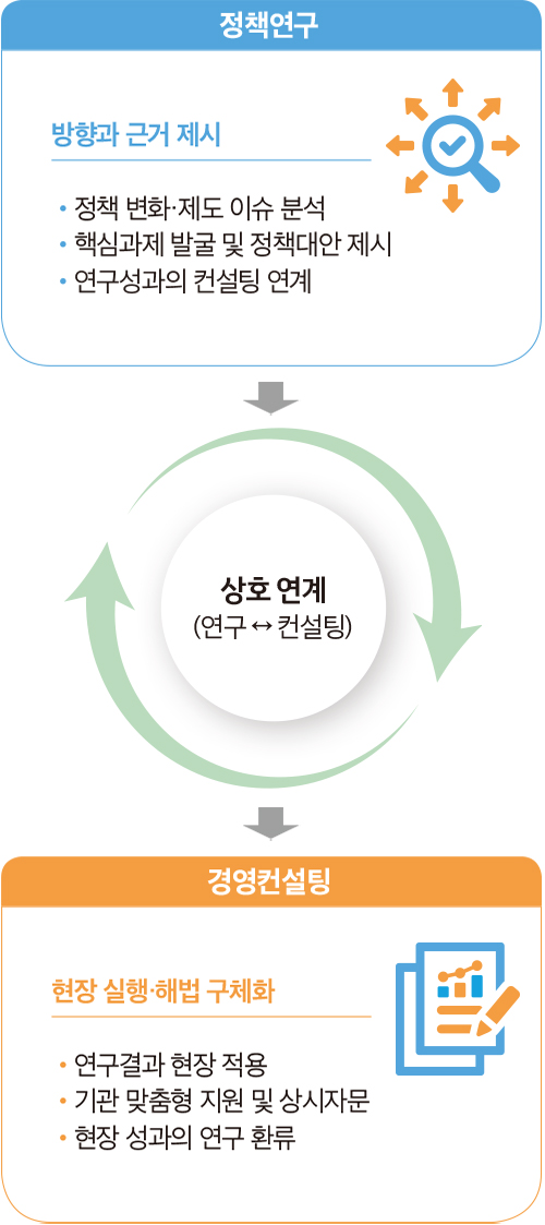 중요한 점은 연구와 컨설팅이 각각 분리된 기능으로 작동하는 것이 아니라, 상호지원 구조 속에서 유기적으로 연계된다는 점이다. 정책연구팀의 주요업무에는 경영컨설팅 지원이 포함되어 있고, 경영컨설팅팀의 주요업무에도