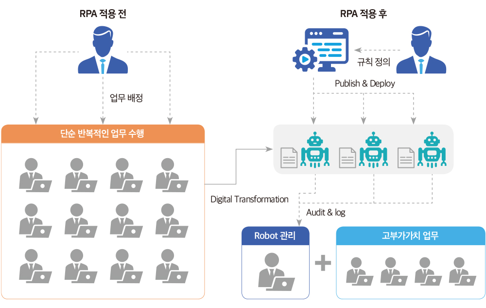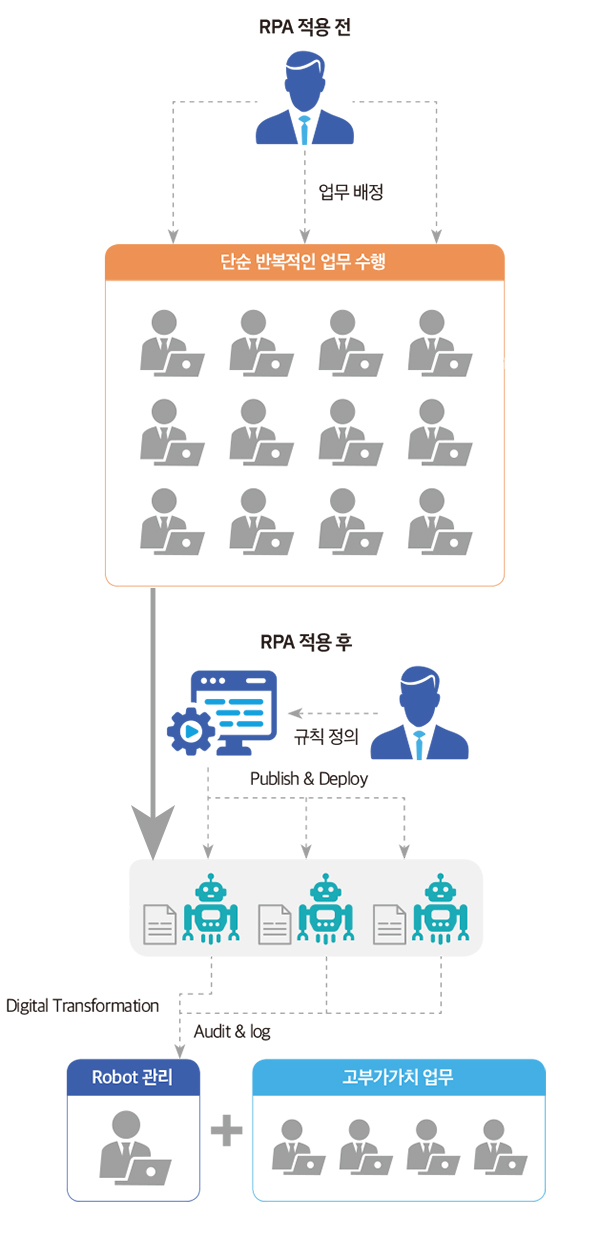 출처: KT DS 홈페이지 반복적이고 비감정적인 업무는 AI·디지털 도구를 사용해서 업무 효율성을 제고할 수 있지만 아직도 창의적인 업무나 감성적인 업무는 인간의 노동이 중요한 역할을 하고 있으며, 앞으로도 AI·디지털 도구에 의해 쉽게 대체되지 않을 것으로 예상되고 있다. 따라서 기업이나 기관은 향후 고용구조를 개편하면서 창의적인 업무나 감성적인 업무가 필요한 분야를 적극 발굴하고 거기에 새로운 인력보다는 기존의 인력을 재배치할 수 있도록 해야 할 것이다.
