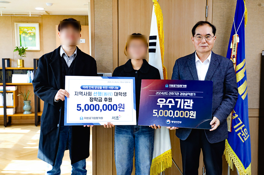 지방공기업평가원(이하 평가원)은 지역사회 선행을 실천하는 대학생과 저소득 가정 아동·청소년을 지원하기 위해 2024년도 경영실적평가 우수기관 포상금 5백만 원을 전달했다.